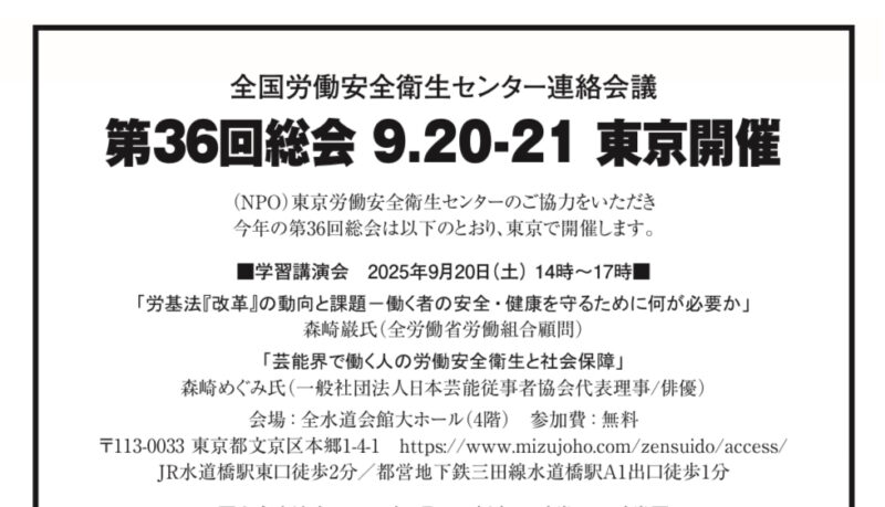 どなたでもご来場いただけるそうですので、ご希望の方は全国労働安全衛生センター連絡会議さんまでお問い合わせください。